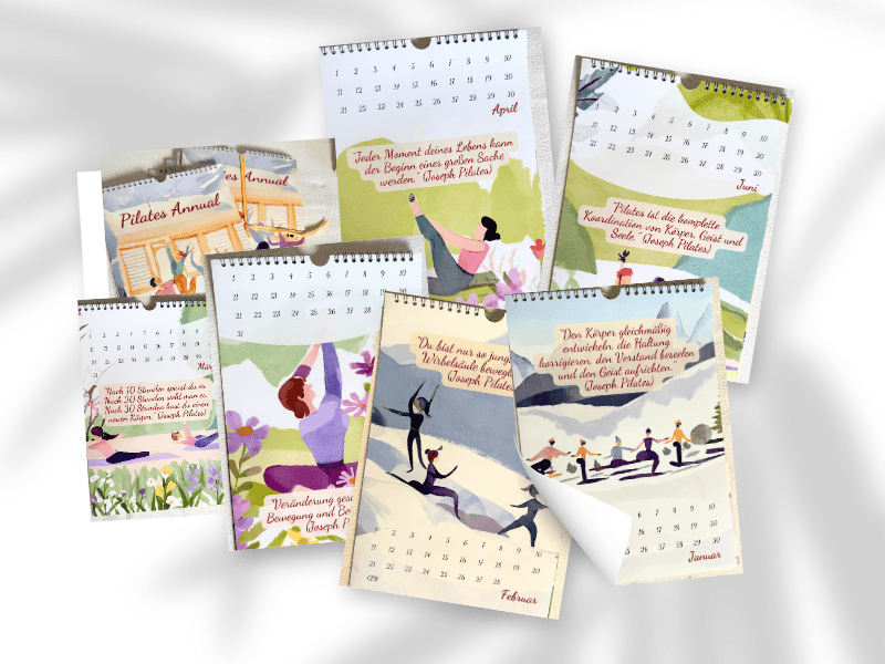 Jeder Monat mit einem Pilatesmodtiv und Originalzitat von Joseph Pilates